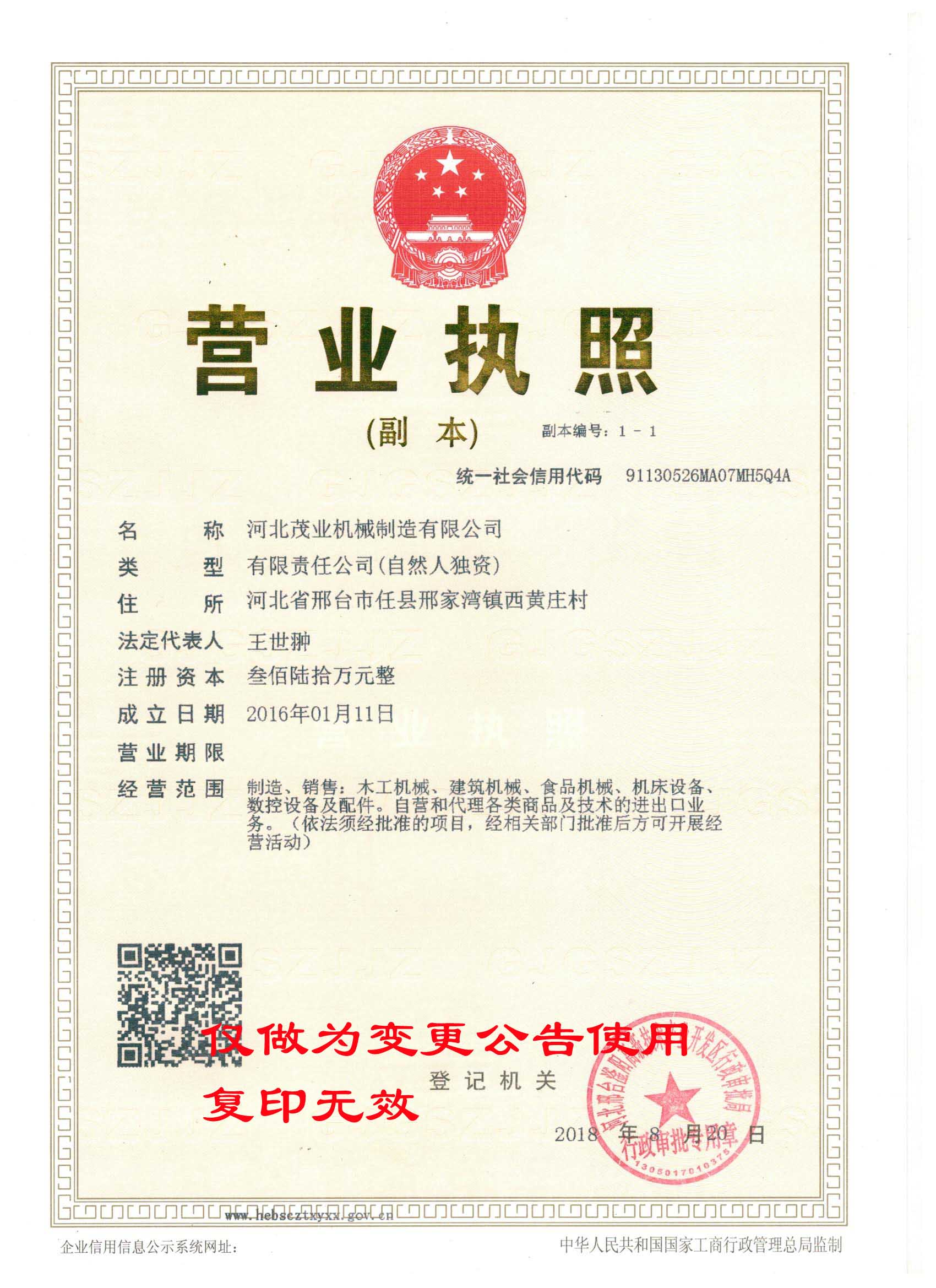 我司邢臺茂業機械制造有限公司,因公司業務發展的需要,現已整體變更為河北茂業機械制造有限公司,并于2018年8月20日取得河北邢臺滏陽高新技術產業開發區審批局頒發的營業執照。現將有關事項公告如下: